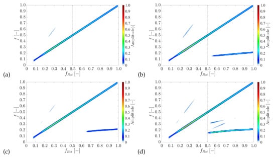 Spectrogram of the rotor response behaviour under the assumption of: (a) Half-Sommerfeld cavitation without thrust bearing (V1); (b) two-phase model without thrust bearing (V2); (c) Half-Sommerfeld cavitation with thrust bearing (V3); and (d) two-phase model with thrust bearing (V4).