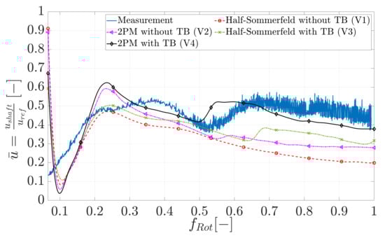 The run-up simulations shown in Section 3.1 are based on the Reynolds equation (Equations (8) and (9)), where lubricant properties are averaged over the gap height. To consider the non-linear oil properties more accurately, the run-up simulations were repeated with generalised Reynolds equation (see Figure A1). In summary, the conclusions can also be adopted here. With increasing level of detail, better agreement with the measurements can be achieved. Consequently, the run-up simulation with two-phase model and thrust bearing shows the best agreement with the measurements. Compared to the simplified Reynolds equation, the overall simulation time was longer by a factor of 10. The rotor response behaviour is summarised in Table A1.