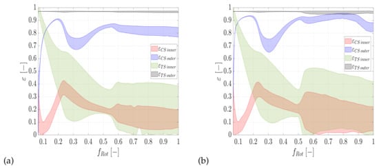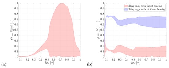 In addition to the stiffness and damping behaviour of the individual bearings, the arrangement and type of bearings also influence the current rotor natural frequency. The radial displacement of the rotor is mainly supported by journal bearings. Consequently, this bearing type contributes to the stiffness and damping in horizontal and vertical rotor direction, while the tilting stiffness is limited. In terms of tilting stiffness and damping, thrust bearings contribute essentially. The rotor tilting results in an asymmetrical pressure distribution at the thrust bearing so that a torque is created, which counteracts the rotor tilting. Thus, the thrust bearing provides a further part to the stiffness and damping, which can influence the current natural frequencies of the rotor. Investigations of the influence of thrust bearings on a full-floating ring supported turbocharger rotor are carried out in [,,,,,]. A variation of the axial load and thrust bearing design parameters is made in []. The simulations show that with increasing axial load, the start frequency of the oil-whip can be shifted to higher speed ranges. This is because smaller lubrication gaps can occur at the thrust bearing so that the hydrodynamic pressure and consequently the stiffness and damping of the bearing increase. In comparison, the number of bearing segments seems to have only a minor influence.
