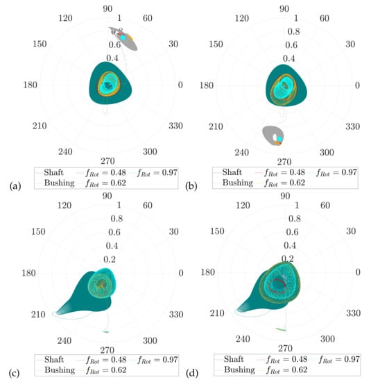 An essential factor for compliance with the requirements is the support of the rotor. This is preferably achieved by using hydrodynamic bearings. Compared to roller bearings, hydrodynamic bearings have a simpler and more cost-efficient design as well as more favourable thermo-hydrodynamic operating conditions. A disadvantage is their highly non-linear behaviour, which can even lead to additional rotor excitations in terms of sub-synchronous vibration [,,,,,,,,,,]. Woschke et al. [,] examined the excitation mechanism in context with the current natural frequencies and damping of the rotor. By solving the eigenvalue problem at the current operating point, including the non-linear bearing properties, a Campbell diagram with the corresponding damping is plotted and the rotor excitation via the half-whirl frequency is evaluated over the entire run-up. It is shown that an oil-whip can occur if a weakly damped natural frequency is excited by an oil-whirl. The current rotor natural frequencies depend on the mass and stiffness distributions of the rotor as well as on the stiffness and damping properties of the individual bearings []. With the occurrence of oil-whips, increased vibration amplitudes, wear and even failure of the rotor can occur. For this reason, a reliable prediction of the critical sub-synchronous vibrations is necessary.