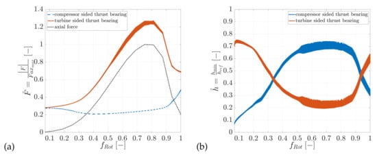 Besides the thermo-hydrodynamic boundary conditions, the run-up process is also considered. Within the shaft motion measurement, the run-up is relatively slow, so that the assumption of thermally steady-state operating condition is valid. In addition, thrust forces occur due to the flow of gases to the impellers. Within the simulation, the lateral forces are specified as look-up tables based on the measurement conditions. In addition, the total thrust bearing clearance is known. Within the simulation, the rotor starts from a minimum speed and accelerates constantly until the maximum speed is reached.