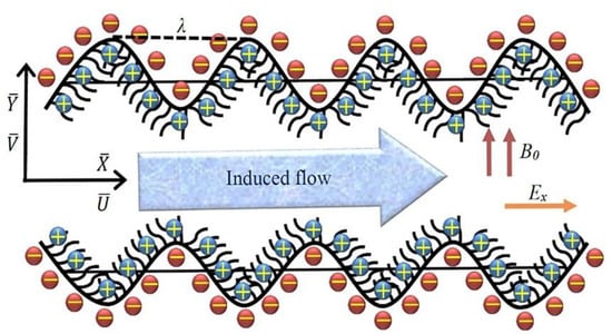 - Jayavel, P.; Jhorar, R.; Tripathi, D. Electroosmotic flow of pseudoplastic nanoliquids via peristaltic pumping. J. Braz. Soc. Mech. Sci. Eng. 2019, 41, 61. [Google Scholar] [CrossRef]