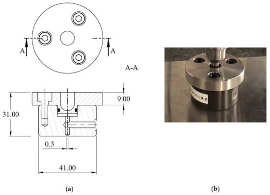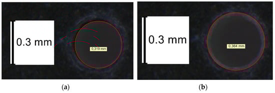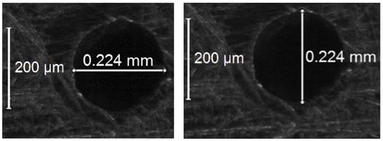 The orifice diameter of the pad was experimentally measured via an electronic microscope, to confirm its actual value and verify the presence of chamfers. Figure 2a,b shows the images acquired through the electronic microscope. These reveal that the orifice presents a diameter of 0.319 mm and a small chamfer.