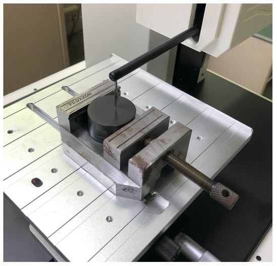 Figure 5 shows a scheme of the experimental apparatus used. This test bench was designed to measure both the static performance, i.e., load capacity and air consumption and the air gap pressure profile of aerostatic pads. The external load was applied through a vertical loading chain composed of a screw nut system (thread pitch: 0.1 mm), a load cell (HBM-U9C 200 N) and a loading tip. To allow the pad to tilt, the end of the loading tip had a spherical interface paired with a spherical housing machined on the center of the upper surface of the pad. During each test, the load applied to the pad and its air consumption were measured by means of the load cell and a digital flowmeter (FESTO SFAH-5U-Q6S-PNLK-PNVBA-M8 and SFAH-1U-Q6S-PNLK-PNVBA-M8). The air gap height was indirectly assessed by considering the relative displacement of the pad in the presence and absence of supply air. The pad displacement was measured by means of three symmetrically placed displacement capacitive sensors (Microepsilon CapaNDCT sensor CS05, Controller DT6220, Preamplifier DL6220/ECL2) fixed on a sensor holder above the upper surface of the pad. Measurement of the air gap pressure distribution was made possible by the presence of two stacked plates: a rotatory plate and a translating counterpad. The air gap pressure was measured through a pressure intake drilled onto the translating counterpad. The position of this pressure intake was defined on the basis of a polar reference frame (, , ) whose origin corresponded to the center of the rotatory plate. The radial coordinate was modified by translating the counter pad on the rotatory plates via a micrometer (MITUTOYO Micrometric Head, Heavy Duty, 8 mm Spindle 0–25 mm). Meanwhile, the angular coordinate was adjusted by rotating the rotatory plates around its center. The radial motion of the counterpad was obtained thanks to the presence of a prismatic guide on the rotatory plate, whereas the angular rotation was obtained thanks to a cylindrical coupling between the rotatory plate and the fixed basement. In this instance, due to the axial symmetry of the pad, the pressure distribution was measured by varying only the radial position of the pressure intake.