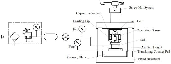 Scheme of test bench used to measure the static characteristics and the air gap pressure profiles of the pad.