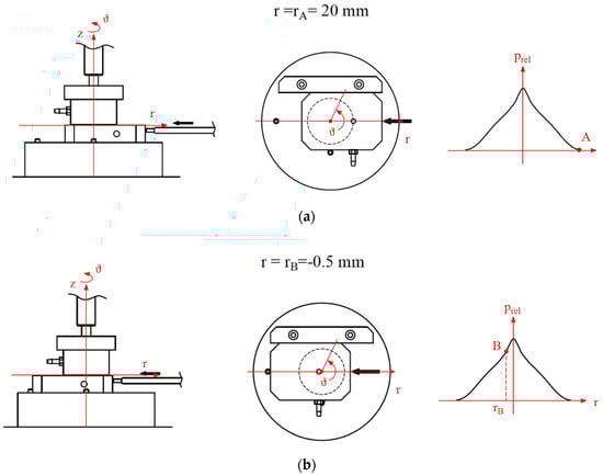 The pressure profiles of the pad were measured in the presence of different relative supply pressures ( 0.41, 0.51 and 0.61 MPa) and external loads. The external load rather than the air gap height was imposed, since it was found that this approach is more reliable when tests have to be repeated. Due to the axisymmetric geometry of the pad, pressure profiles were measured only in the radial direction at = 0°, for radial coordinates ranging from = −0.5 to = 20 mm. The points acquired at negative radii were acquired to better identify the position of the center of the supply hole of the pad and suitably compensate for accidental offsets of the micrometer. The density of the acquired point was gradually increased moving from the edge of the pad to its center. Figure 9a,b show schemes related to this kind of test by illustrating the initial () and the final () positions of the pressure intake. After the pad was supplied, the pressure intake was placed at the initial position where the desired external load was imposed. Thereafter, the pressure intake was moved from the initial position A to the final position B where the test ended. For each point of measure, the correspondent radial coordinate , pressure , air flow , air gap height and load capacity were acquired.