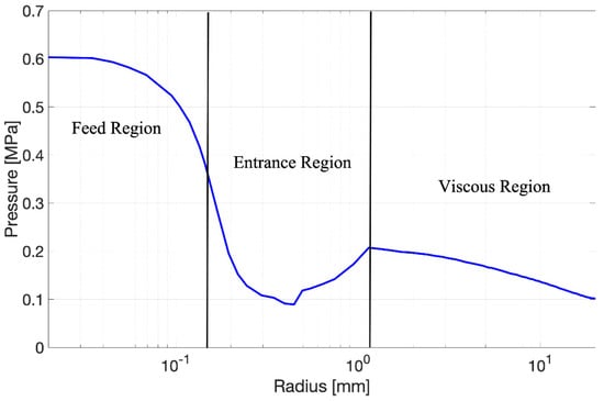 It is worth pointing out that, in this instance, the experimental values considered in this procedure were taken at 3 mm. This choice was due to the evidence that the measurement performed at 3 mm were probably influenced by the interaction between the pressure intake and the pad orifice []. Thereafter, in both the methods, Equation (7) is exploited to compute the pressure values at the edge of the pad orifice on the basis of the experimental pressures measured at the correspondent radii :