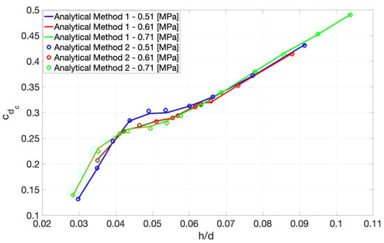 Figure 12 and Figure 13 report the results obtained through the two proposed identification methods. The results were obtained both for and . Figure 12 shows the trend of expressed as a function of the ratio of the air gap height to the orifice diameter at different relative supply pressures: = 0.41, 0.51 and 0.61 MPa.