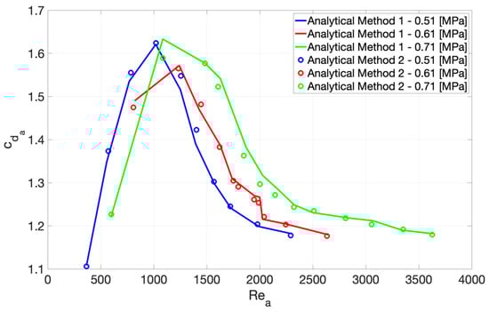 Figure 13 shows the trend of expressed as a function of the correspondent Reynolds number at different relative supply pressures: = 0.41, 0.51 and 0.61 MPa. Accordingly to the results obtained in [], , firstly, increases with the Reynolds number, reaches a maximum value and finally tends to the unit value. As for , also the trend of is slightly influenced by the supply pressure, since as the supply pressure is increased, the curves gradually move to the right.