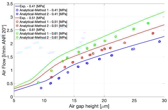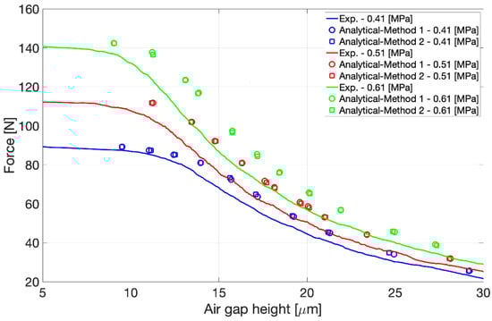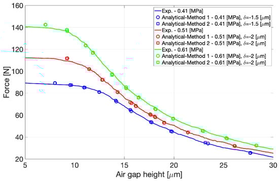 As can be seen, the analytical results are in very good agreement regarding the force and the air consumption, but the values of the air gap height are overestimated. This overestimation may be attributed to different aspects relating to the flatness of the pad and the counter pad (see Section 2.1 and Section 2.2). In fact, as discussed in [], the performance of pads with not perfectly flat surfaces can be studied by considering an equivalent gap. To verify this hypothesis, as in [], the analytical curves obtained through the proposed identification methods were shifted by =1.5 m (for = 0.41 MPa) and = 2 m (for = 0.51 and 0.61 MPa). As appears in Figure 16 and Figure 17, the shifted curves match almost perfectly with the experimental ones.