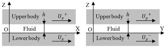 denote the average velocities in the upper and lower surfaces in the XY-direction, respectively. When the mass conservation law is applied to Equation (41), the following modified Reynolds equation is obtained.