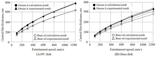 Figure 3 illustrates the calculation conditions. The upper body was a steel ball, and the lower body was a disk composed of glass or polycarbonate (PC). The rheological properties of the grease were assumed to be represented by Bauer’s model, according to existing literature [