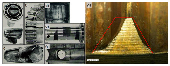 (a–f) Fretting wear of different machine elements [1] and (g) loss due to fretting wear.