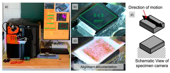 Figure 2 shows the test bench, information on the specimen setup and contact alignment procedure. The bench-top apparatus is shown in Figure 2a, and all preparation and handling activities can be performed on the table. The normal force drivetrain extends to below the table-top, where the power and measurement electronics are also placed. The power and measurement electronics are in separate cabinets. A display is placed nearby with a mouse and keyboard to operate the machine. Figure 2b shows the ideal contact area for specimens. The upper and lower specimens are 8 mm wide, 10 mm long and have a thickness of 3 mm. Because the specimens are rotated by 90° on their 10–8 mm surface normal, as shown in Figure 2d, the ideal contact is a square of 8 mm side length. The extra 2 mm length offers space for the motion of the upper specimen and a clamping position tolerance for the lower specimen. If the surface roughness and roughness orientation are critical for an experiment, the specimen orientation must be considered in the setup.