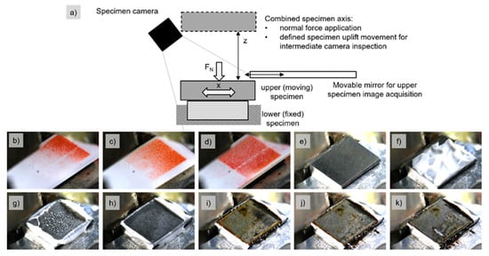 Figure 3a shows the schematic of the opening procedure, where the normal force drive can also unload and move the upper specimen to a defined position, where the upper specimen holder completely clears the sight of an angled camera. The camera is mounted on the orange casing parts shown in Figure 2a. The process is automated via the axis positions and regular checks for plausible normal forces while the contact-opening sequence is being performed. Additionally, a movable mirror as the actual setup on the machine is shown in the schematic of Figure 3a. The mirror can swing in between the specimens while the contact is open to allow the recording of images of the upper specimen. The mirror was added subsequently to the tests performed for this study. The other images of Figure 3 show: (b) to (d) the iterative procedure of contact alignment; (e) the initial condition of the lower specimen; (f) lubrication application and amount; (g) lubrication squeeze out after a single force application; (h)–(k) test images while running until failure.