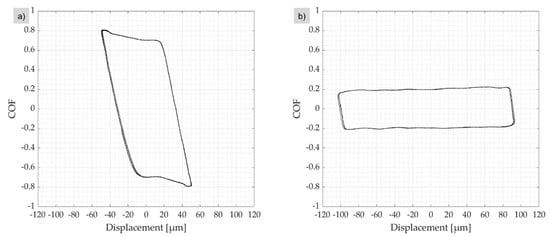 The acquired data are displayed and saved in different ways. The data from the friction and displacement measurement are usable to show fretting loops [4]. With these hysteresis loops, the contact condition or fretting regime can be distinguished between partial slip and gross slip. Additionally, the mixed slip is possible if low and high friction with a loss of the effective sliding stroke through the elastic deformation occurs over time. Figure 4 shows data acquired from the test bench. Both examples were taken from tests with a 2 kN load. The deformation of the contact as well as the test bench structure (mostly Aluminum structure, around 12.5 µm/kN) is part of the measurement since there is only one displacement sensor. A partial slip with very low strokes can be achieved by motion control and could be a topic of future studies. The coefficient of friction (COF) for time diagram data is also calculated with peak-to-peak values, root mean square (RMS) values or other methods from the raw force loop data. The peak values are used for later interpretation.