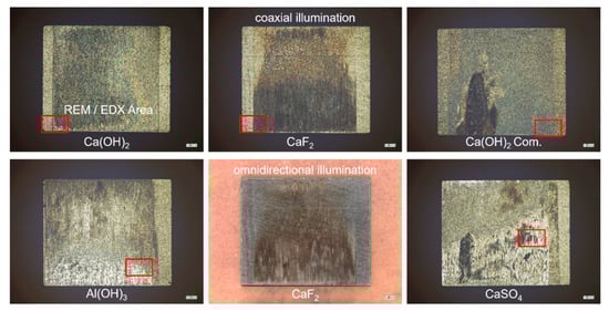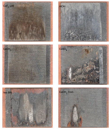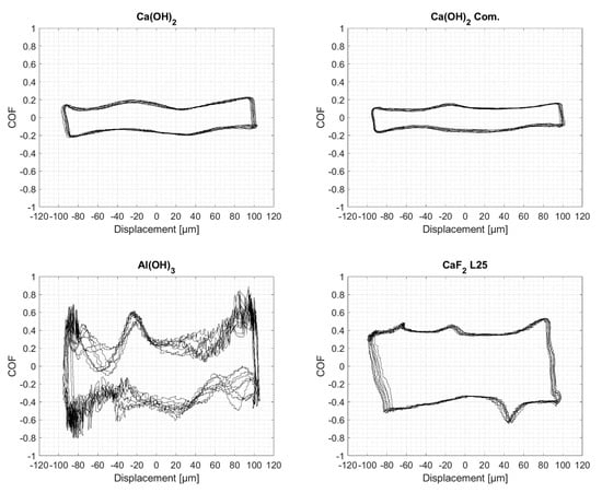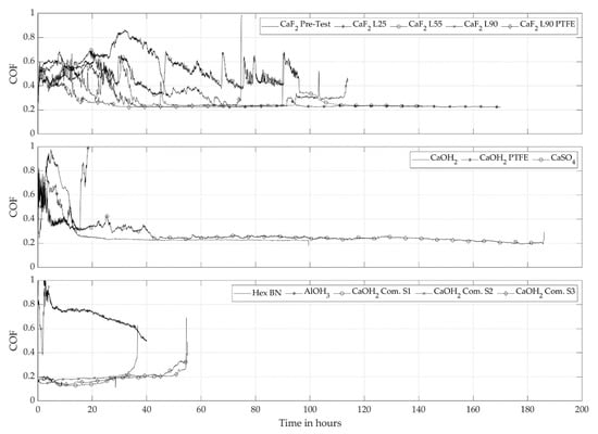 In Figure 5, graphs of the raw Ca(OH)2, CaF2 and CaSO4 pastes also show a significantly higher COF level at the start, which in most cases stabilized over the course of the experiment. This could last for up to 50% of the TtD. The commercial Ca(OH)2 paste appeared with the most stable performance, which is preferable for a defined friction behavior in an application.