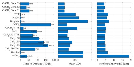The online and image data of Figure 5 and Figure 6 show the initial damage type on the lubricated test specimen and the initial and progressive damage mechanisms. The different lubricants can be clearly divided into a fretting wear avoidant category and a non-effective category. This can be seen in Figure 7, with bar graphs of the corresponding time to damage (TtD), mean coefficient of friction (COF) and the stroke stability as a measure of any noticeable stick slip. This is the standard deviation of all measured stroke values. Stroke stabilities smaller than 5 µm indicate a stable run without stick slip.