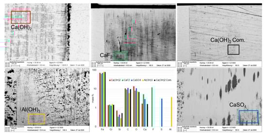 The chemical analysis clearly indicates calcium as being a constituent. The main ratio, however, seems to be iron oxide (see Figure 10). Literature reported that the presence of calcium hydroxide supports the formation of more mechanically stable Fe3O4 modification [7]; however, it was not possible to analyze to what extent that might have happened. Further analysis with RAMAN spectroscopy could lead to further insight into the composition of tribolayers [19,20].