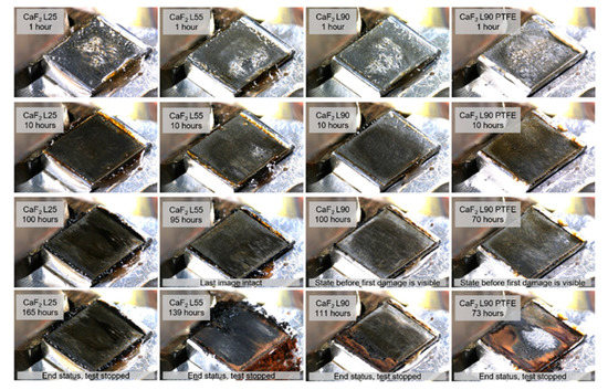 Calcium fluoride, also known as fluorspar, has been known as a high-temperature lubricant for decades [21,22]. Similar to calcium hydroxide, its beneficial properties evolve only at higher temperatures and pressures, and hence, it currently finds application in material composites for grinding, for dry running materials or in antiseizing pastes. However, its use as an additive for greases [23] or polymers [24] has also been investigated. Similar to calcium hydroxide, fluorspar showed an impressive tribolayer built-up performance during the fretting tests, as can be seen in the time-lapse extracts of Figure 11.
