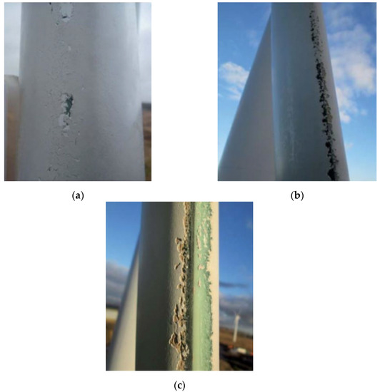 Damaged wind turbine blade at the leading-edge showing (a) pinholes, (b) gouges and removal of material, (c) major loss of material and damage to GFRP. Source: [8].