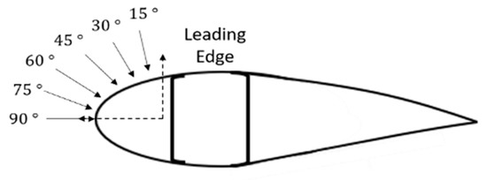 The primary variables chosen for this investigation were the impact angle and impact velocity. The first was chosen to represent the different angles at which rain impacts on the turbine blade leading edge, helping to indicate the erosion wear mechanism taking place on the sample. The impact velocity represents different rotor velocities along the turbine blade, which is maximum at the blade tip. This helps indicate the level of erosion with a change in velocity and how it affects the rate of wear. The impact angles of the leading edge of the blade are demonstrated in Figure 2. All samples had the same test repeated in four identical cycles to produce continued, gradual wear to try and associate the exposure time of the samples to the development of defects such as pin holes, gouges and cracks [8].