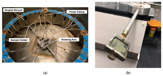 There are many ways to recreate the conditions of a wind turbine blade in the field within laboratory conditions and there have been some issues with cross referencing results from different methodologies [4,11,12]; however, the technique that replicates the conditions closest would be a whirling arm erosion rig (WARER) as stated by the DNVGL recommended practice [13]. The rig that was used for this investigation was built in the University of Strathclyde in the tribology laboratory to artificially simulate turbine blade conditions [14,15]. This was achieved with a water tank connected to the peristaltic pump through tubing, then connected to 16 droplet needles of the chosen gauge (23 G). These needles were tested to measure the average size of droplet they produce which was 2.40 mm; this was accomplished using high-speed photography. The droplets were also captured by the high-speed camera while the rig was in operation to determine there was little effect of aerodynamic forces. The needles were arranged as shown in Figure 3, inside a stainless-steel enclosure. Two samples of different impact angles were secured in the sample holders at each end of the removable rotor arm and adjusted to the desired angle orientation. The rotor arm was then secured in the test rig by a central hub, connecting it to the driving motor. The pump reservoir tank was then filled appropriately. Before testing, the pump was switched on and left to run for 5 min to ensure flow equilibrium and that all droplet needles were active.