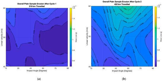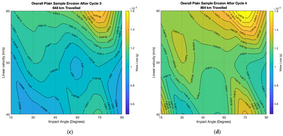 The mass loss from each sample was recorded and is shown in the form of an erosion map, which displays the relationship between impact velocity and impact angle in terms of mass loss [10]. The four maps, Figure 4a–d, show the four cycles the samples were exposed to and the combinations of linear impact velocity and impact angle which result in the most erosion.