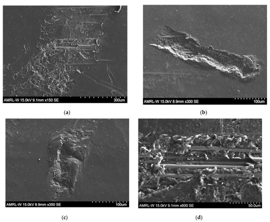 Based on the literature [16], the two main forms of erosion that the sample will encounter during testing are so-called ductile erosion and brittle fracture, as seen in Figure 5a,b. Although these figures show morphologies indicating particle impacts, similar features were observed for high velocity water impacts, as seen in the recorded Figure 5. More ductile materials have a higher erosion response at low angles of impact such as 15–3, depending on conditions [17]. This results in plastic deformation and gouging. Consistent with the literature [16] (although this depends on the conditions), materials that are intrinsically more brittle in behaviour have a higher erosion response at higher angles of impact, such as 75–9. This will potentially result in a fracture, crack or delamination. In this case, the G10 glass epoxy material showed peak erosion at 45–60 degrees, which is a crossover between these two characterizations. This showed evidence of both the ductile and brittle material degradation mechanisms, visually inspected from the micrographs in Figure 5. Hence, these mechanisms are the initial stages of erosion, which create initiation sites which are possibly more vulnerable to further erosion, due to the increased surface roughness. These sites are normally small pinholes in the material and are broken down quickly by lateral jetting [18], exploiting, exploiting pinholes to form cracks and removing material from the sample.