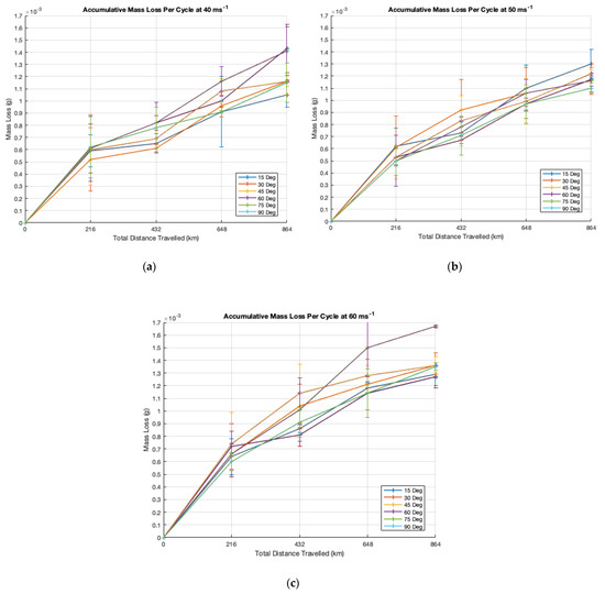 Accumulative mass loss for each impact velocity: (a) 40 ms−1 (b) 50 ms−1 (c) 60 ms−1.