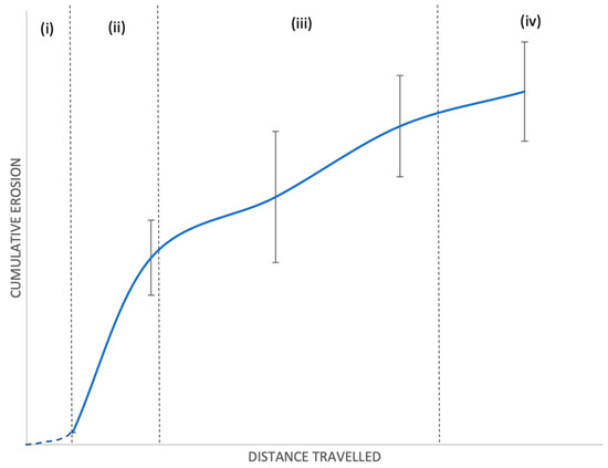 A schematic line graph of cumulative erosion against distance travelled created using averaged data from Figure 6 which outlines the different stages during erosion. (i) Incubation period, which was not observed during this investigation and is shown as the blue dotted line. (ii) The linear increase in erosion also known as the acceleration stage. (iii) The deceleration stage. (iv) Terminal stage.