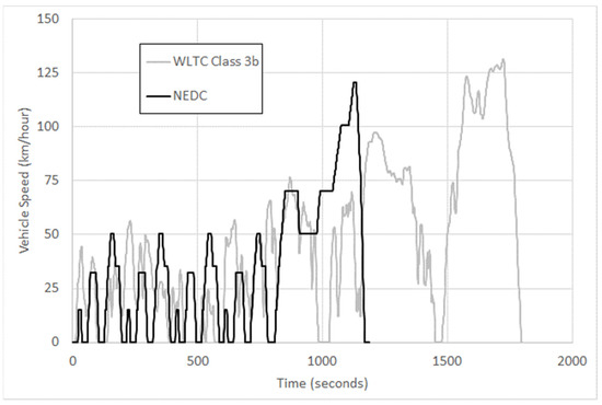 OEMs that manufacture and sell electric vehicles are required to give information on how much energy is needed for the vehicle to travel 100 km. These energy efficiency figures will have been obtained on standardized driving cycles, such as the older NEDC driving cycle used in Europe until 2017, or the more recent WLTC driving cycle or their US equivalents. Figure 1 shows the vehicle speed versus time profile of some typical European standard driving cycles. Based on these driving cycles, electric vehicle manufacturers report energy efficiency figures of between 15 and 25 kWh of energy to travel 100 km (with heavier vehicles requiring more energy to travel 100 km) [7,8]. This can be contrasted with a fuel-efficient passenger car that is powered by a gasoline engine. For the sake of argument, assume the gasoline car has a fuel consumption of 6 L/100 km (which is the equivalent to about 47 miles per (imperial) gallon). The energy content of 1 litre of gasoline is approximately 34 MJ [9], and so the energy needed for the car to travel 100 km is about 204 MJ, which is about 57 kWh. Therefore, a BEV is typically between 2 and 3 times more energy efficient than a conventional gasoline car. (In fact, since most gasoline cars on the road are likely to have significantly higher fuel consumption (i.e., higher than 6 L/100 km), BEVs could be even more energy efficient than this simple estimate suggests).