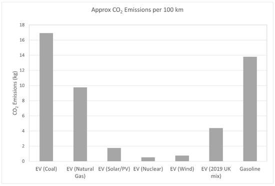 CO2 emissions (in kg) for a car travelling 100 km. The electric vehicle emissions were in accordance with an assumed energy consumption of 20 kWh per 100 km, and for the gasoline car, it was assumed that the fuel consumption was 6 L/100 km. The data in Figure 1 use the equivalent CO2 emissions per kWh from reference [11] and assume that 2.3 kg of CO2 is emitted per litre of gasoline consumed [12].