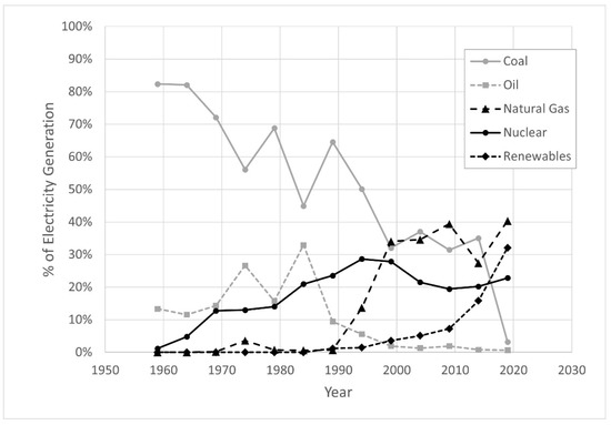 Graph showing mix of UK electricity over time. From the 1950s until 2000, coal was dominant (although in 2020 is now much less than 5%). In 2020, natural gas, wind/solar and nuclear were the main sources of electricity in the UK.