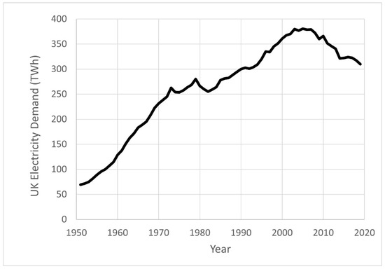 Graph showing UK electricity demand (in TWh) over time. Note the peak demand was around 2005 at approximately 380 TWh, compared to the 2020 demand of about 300 TWh. Data are from reference [18].