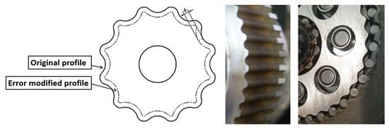 During the calculations, profile failure can be generated by shifting the theoretical cog curve without any failures by value “” (failure) into the normal direction of the profile. The interpretation of the profile failure can be seen in the following figure (Figure 1).