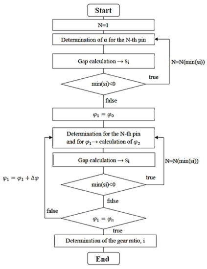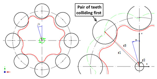 Here, is the rotation angle of the eccentric cam required for the collosion, N is the number of the connected pins, is the gap calculated at the pin i, is the number of pins defined for the minimum gap, is the rotation angle of the eccentric cam , is the rotation angle of the planetary gear, and is the grade of the rotation angle of the eccentric cam.