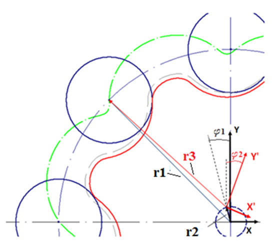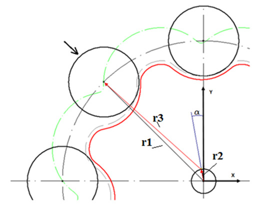 The equation describing the shifted curve is given in the coordinate system , which is attached to the planetary gear. The vector indicated in this system will be converted into the coordinate system created for the (4) ring gear. After that, we make it equal with the vector pointing at the center point of the pin .