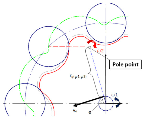 When the shaft rotates, the planetary gear makes an orbital motion, i.e., it does not rotate, but its center point moves along the circle determined by the eccentric cam (Figure 3). The rotation angle of the input shaft required for the hit always has to be determined for the first pin located left from the pole point (where the absolute velocity equals zero) applicable to the theoretical curve (without any failures).