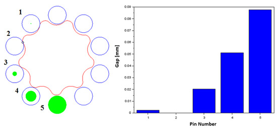 As it is shown by the algorithm, the rotation angle of the input shaft needed for the hit was determined first. It can be seen that pin number 2 hits first (Figure 8). On the left-hand side of the following image, the gap belonging to certain pins are marked with a circle. The gap size is proportional to the circle diameter. On the right-hand side of the picture, the column diagram also shows the gap size.