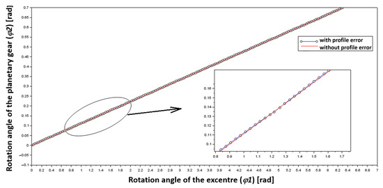 Transmission fluctuation caused by production failures was established numerically for different gear geometries. The findings suggest that the transmission changes depending on the rotation angle of the output shafts [5,6,7,8]. The required production accuracy can be estimated for the particular maximum transmission failure in advance by relying on a derived analytical formula based on the maximum transmission fluctuation calculated for a particular module, profile failure, and cog number.