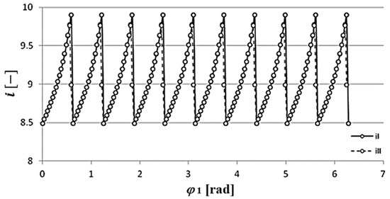 The following diagram shows the transmission change, which was determined in two different ways. The transmission change calculated using Equation is marked with , and the change in transmission determined using Equation is marked with . The transmission was determined supposing the rotation of the eccentric cam in , in grades of . Rotation angle figures of the planetary gear aligned to particular rotation angles of the eccentric cam are shown in the following figure (Figure 10).