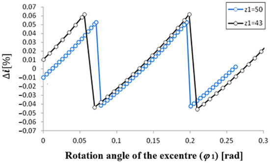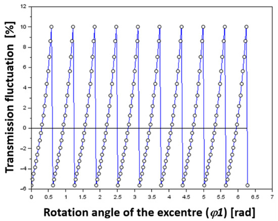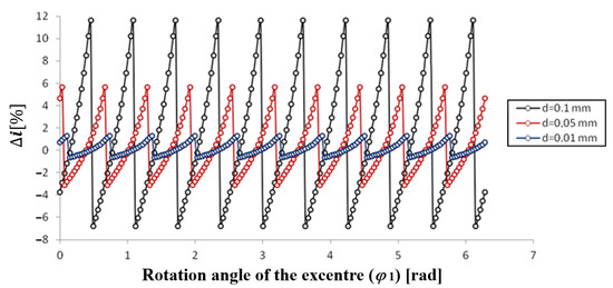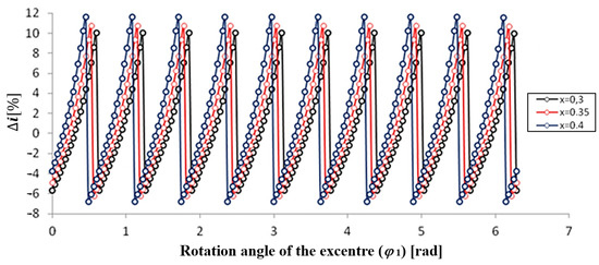It is important to investigate how further cog parameters affect transmission fluctuation. The percentile transmission fluctuation calculated by using Equation (10) is shown in the following examples. The impact of the increase of the profile shift coefficient is shown in the next figure (Figure 12).