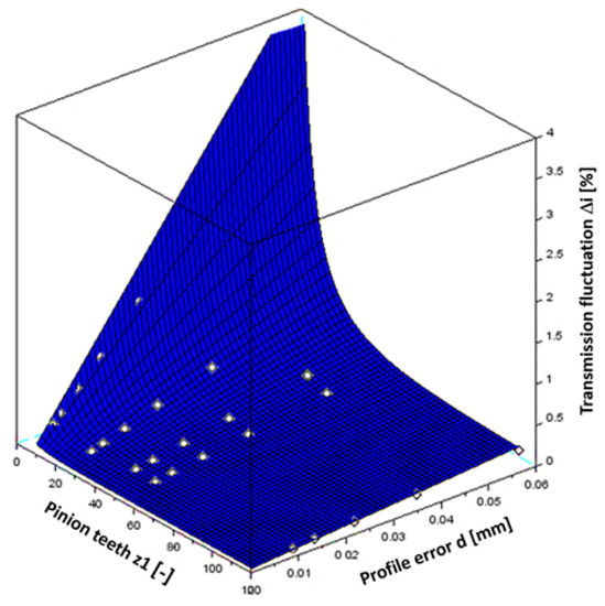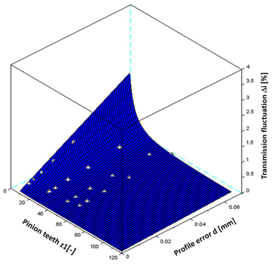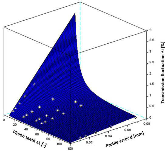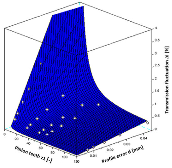 The results and the equation of the fitted surface also suggest that the maximum value of the transmission failure changes linearly depending on profile failures and along a hyperbole in terms of the cog number. Knowing the approximate connections (equations), the minimum production accuracy can be estimated if we know the maximum transmission fluctuation as well.