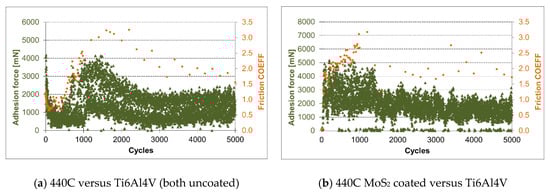 Fretting test (high vacuum): adhesion as function of cycles for AISI440 (disc) to Ti6Al4V (pin): (a) disc and pin blank, no lubricant, (b) Disc AISI440C coated with MoS2, Pin Ti6Al4Vblank.