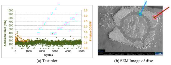 Fretting test (launch): (a) adhesion as function of cycles for Mumetal to itself (blank). (b) SEM image of contact zone of disc, wear zone does not show typical signs of adhesion (Compare Figure 4, (→)).