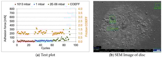 An example of high adhesion even under launch conditions is seen in contact of silver against itself. Adhesion is already seen in low vacuum (from approx. 40 cycles in total). It then increases strongly after reaching high vacuum to values that almost exceed the test devices’ separation forces (Figure 7). Additionally, the SEM image showing typical marks for adhesion underlines that high adhesion. (These high adhesion forces are similar to the results from a test done in fully in high vacuum.)