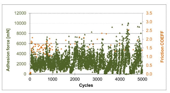 Under high vacuum, a typical behavior for many materials used in space is seen with Mumetal (Fe-based austenitic alloy). If in contact with itself and fretted in high vacuum, high adhesion forces with peaks up to almost 14,000 mN can be found. These high forces are typical for austenitic Fe-alloys, but also for face-centered-cubic materials (Cu, Al, …). Although the test materials were poly-crystalline, the ductility is seen as the reason for forming high “clean real contact areas” and therefore higher adhesion forces. Contact area may be divided into: nominal contact being the macroscopically visible one in a flat-to-flat contact or the one calculated form Hertzian theory (assumes perfect smooth surface). Due to roughness, only a few tips are in mechanical contact, this shall be referred to as “real contact area”. Finally, even this area might be covered by oxides, etc. which inhibit cold welding. Hence, the cold welding will be established only on a sub-part of that: the “clean real contact area”. SEM image in Figure 4b shows a morphology typical of for adhesive wear.