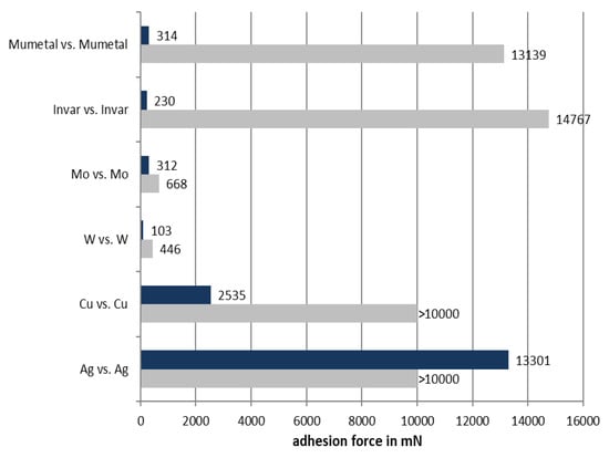 Maximum adhesion force from tests in high vacuum (dark blue) and in launch conditions Air-lowVac-highVac (light grey). Adhesion forces and wear mechanisms depend strongly on the materials.