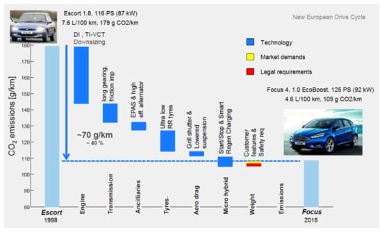 In the past decades, engineering advancements in manufacturing have enabled approximately 40% reduction in CO2 emissions. The average fuel economy for compact cars has increased from 30 mpg (7.8 L/100 km) in the 1980s to 50 mpg (4.7 L/100 km) because of the broad acceptance of fuel-stratified injection (FSI), direct injection technology, variable valve timing, variable compression ratio, cylinder deactivation, powertrain electrification and other efficiency-boosting solution, Figure 1.